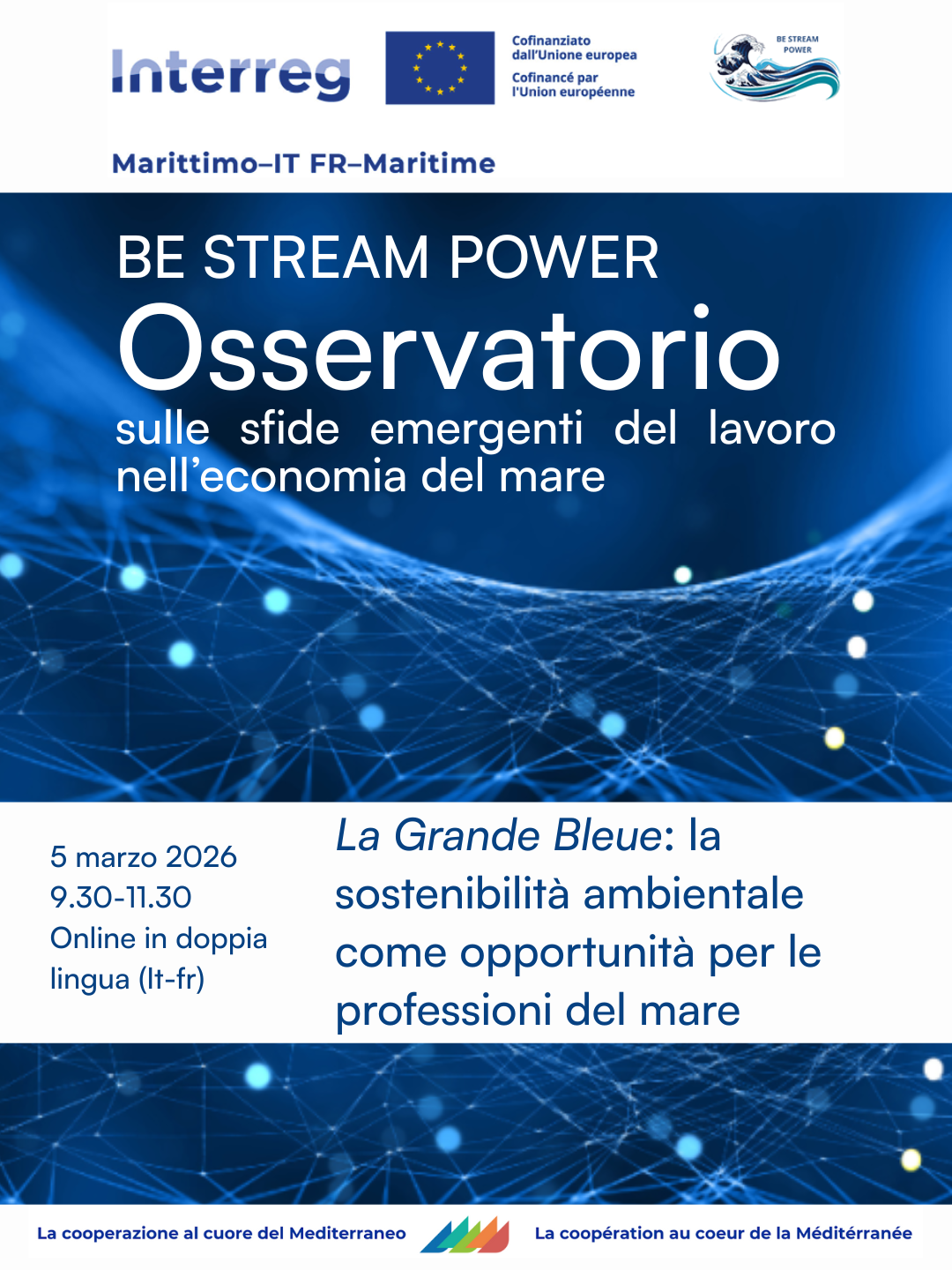 Appuntamento on line il 5 marzo alle 9,30 per affrontare le sfide del mercato del lavoro nel prossimo futuro. Dopo l’Intelligenza Artificiale, il progetto Interreg Marittimo 2021-2027 BE STREAM POWER, finanziato alla Provincia di Livorno e di cui gestiamo le attività, affronta la sfida della sostenibilità ambientale per le professioni della blu economy. Nella seduta on line dell’Osservatorio Transfrontaliero giovedì 5 marzo si confrontano partner e stakeholders delle cinque regioni dell’area di cooperazione, coordinati dalla Regione Toscana. Nell’incontro sarà delineato un quadro sull’ecosostenibilità e il suo crescente impatto sul mercato del lavoro nell’economia del mare, con l’intervento di esperti di settore e il contributo di buone pratiche in materia. Gli incontri dell’Osservatorio proseguono con le pari opportunità per tutti e di genere (17 marzo), le crisi, transizioni e riconversioni (31 marzo), il sociale: economia sociale e inclusione lavorativa (9 aprile). Link per iscriversi e aggiornamenti sul minisito del progetto https://interreg-marittimo.eu/web/be-stream-power
